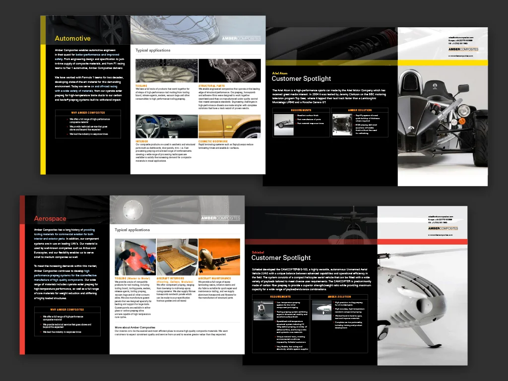 We essentially built the whole program around several key cases of products that were built and highlighted key areas of the shaping that were unique to this company. We used dramatic photography to emphasize the beauty-capability of the composite technology yet still emphasized the technical details as well.